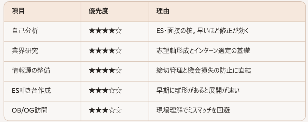 自己分析と業界研究を最優先に、情報源とESの叩き台を用意して「応募→振り返り→改善」を回しましょう。